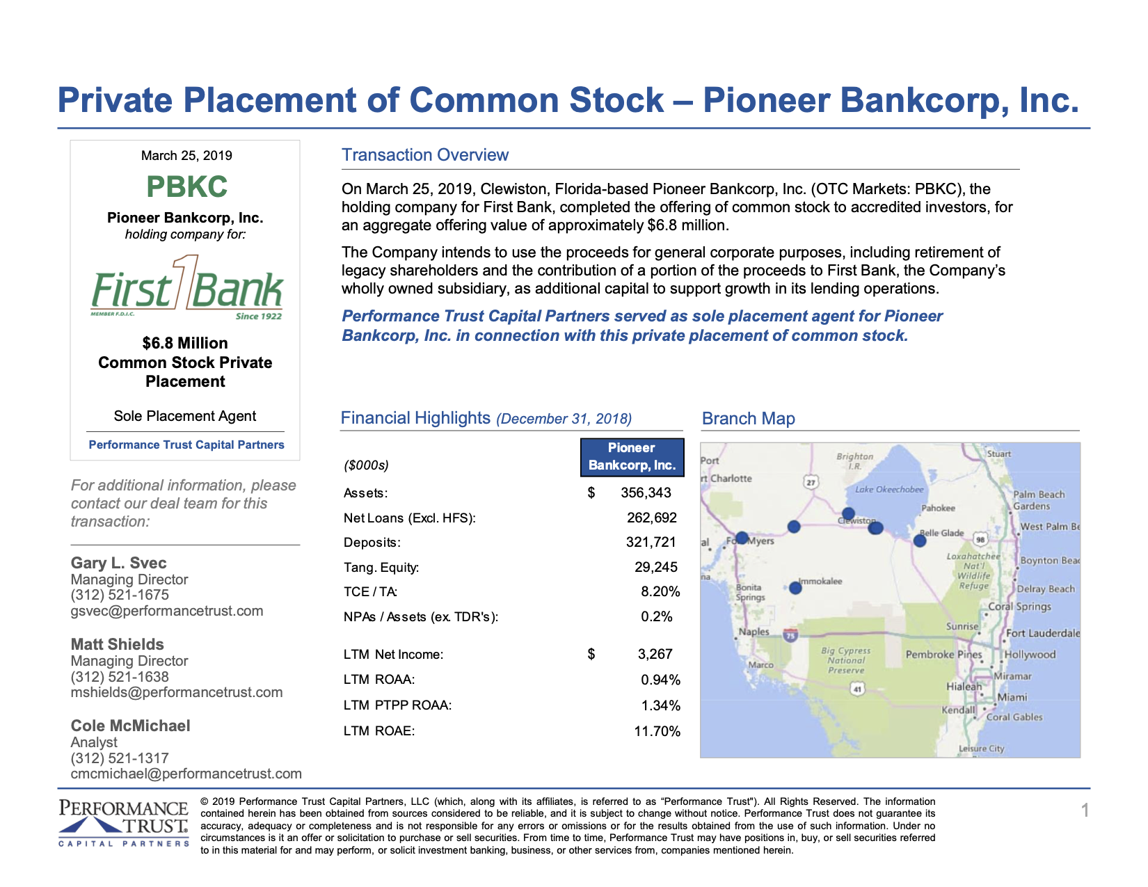 - 3/25/2019: Pioneer Bankcorp (PBKC) completes $6.8 Million Common Stock Private Placement